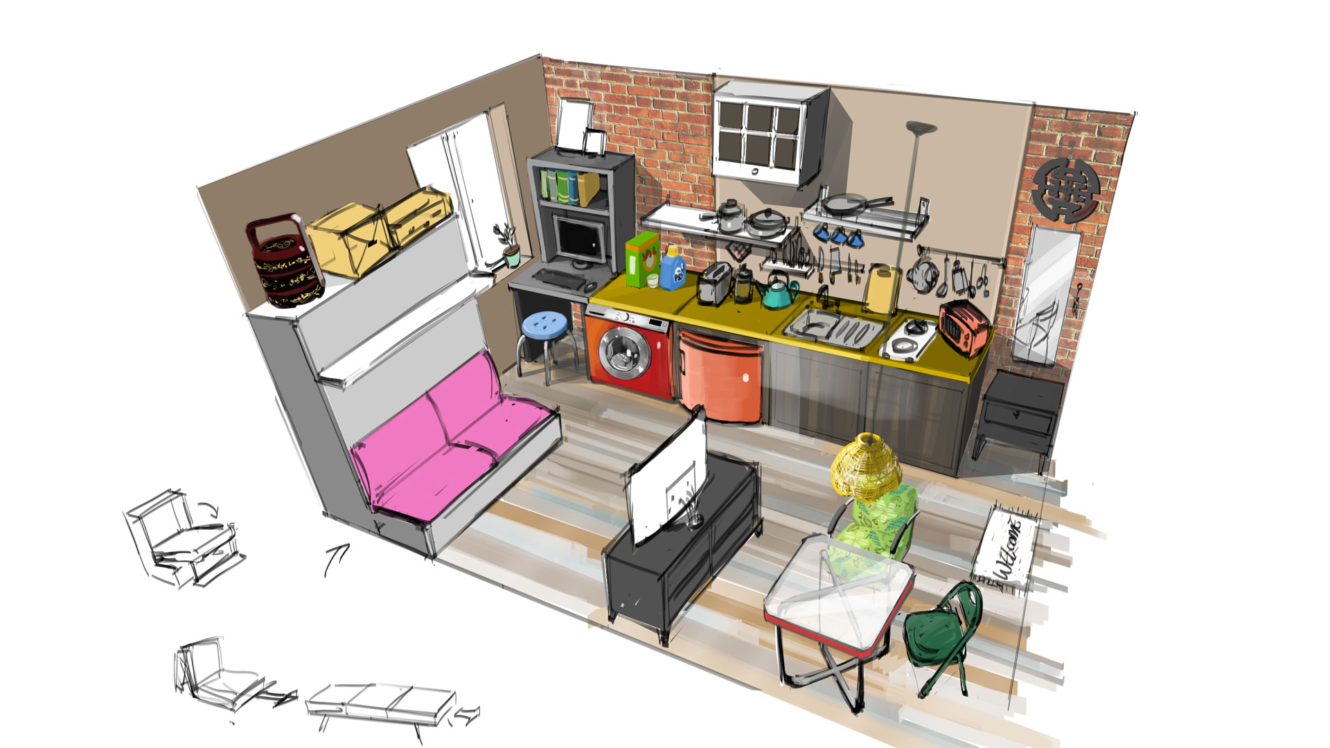 Похоже, что команда The Sims планировала вернуть в игру стиральные машины, которые впервые были представлены в The Sims 3 Карьеры. На недавно показанном концепт-арте с процесса создания квартир как раз была замечена эта бытовая техника. Тем не менее, кажется, ничто не может сравниться с разговаривающим туалетом... Кстати, на этом же рисунке виден и раскладывающийся диван, что было бы отличным объектом для небольших реалистичных квартир.