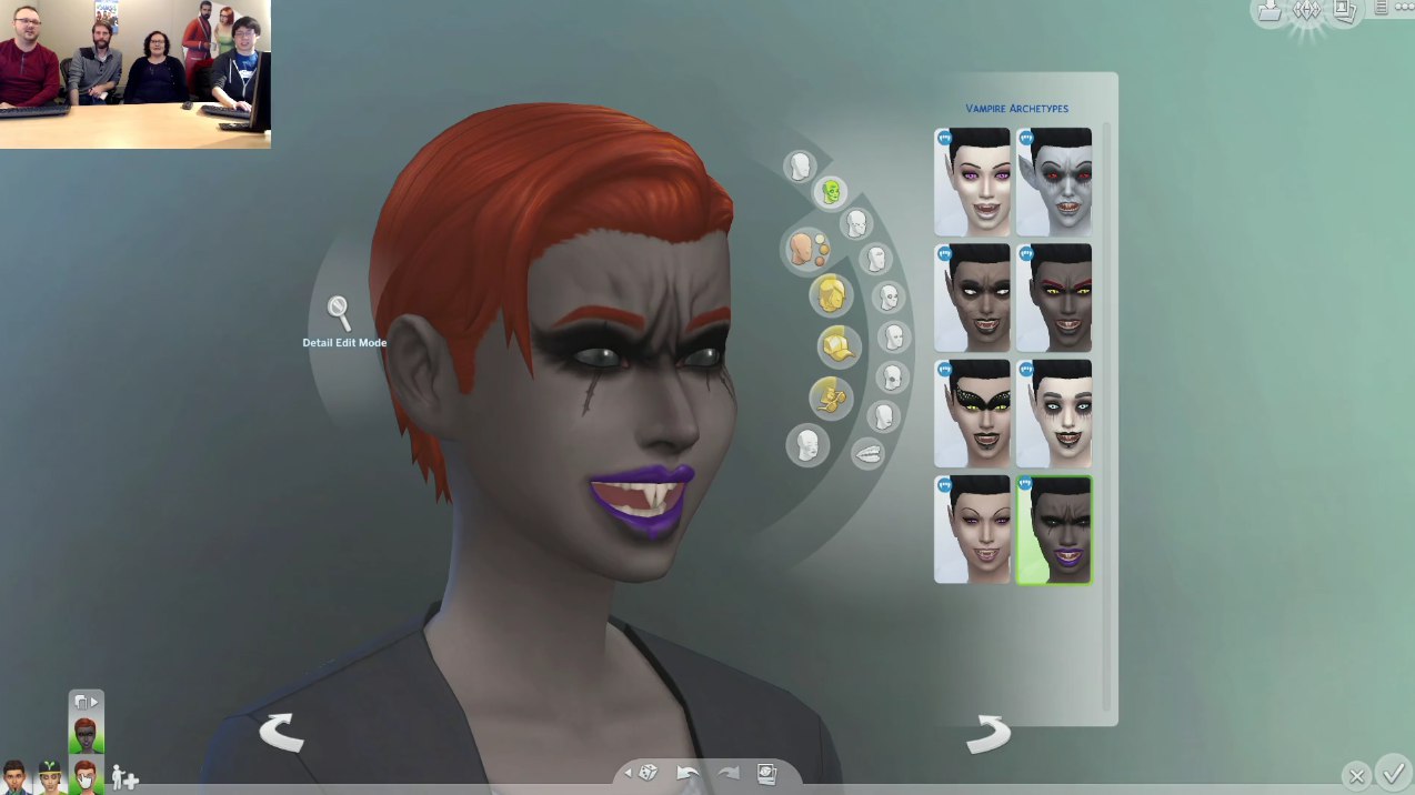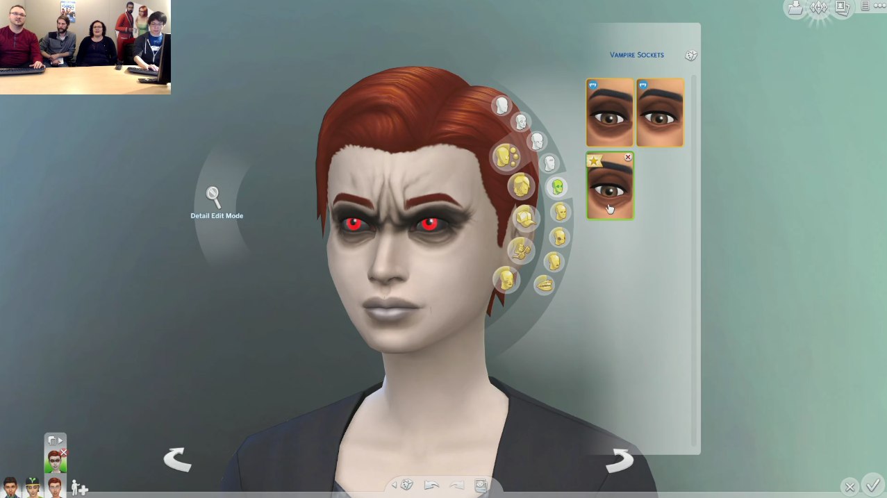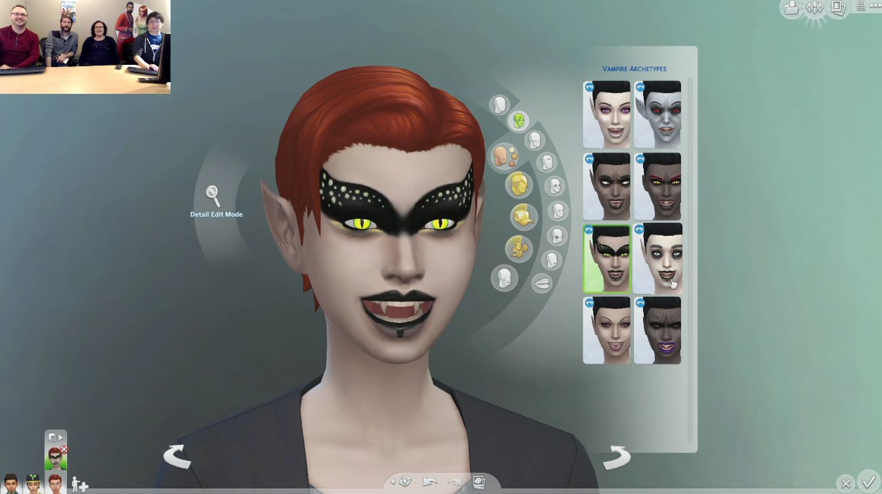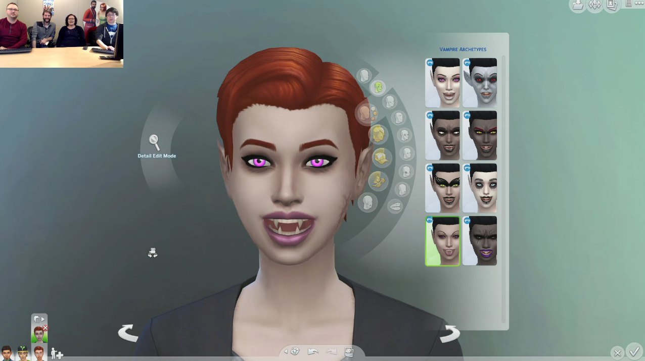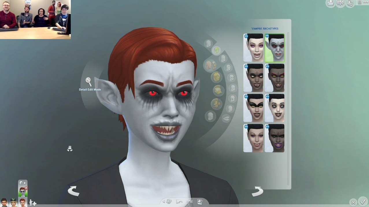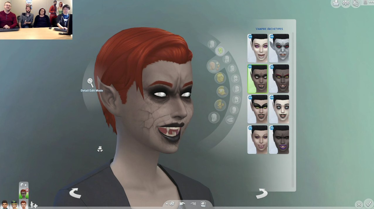 Доступно 10 новых цветов глаз, 3 брови, 3 глазницы, 4 особенности глаз, 4 детали для щек (вены, трещины), 4 детали для рта и 4 типа вампирских зубов. Всё это не является макияжем и может быть наложено поверх него. Новый раздел "Архетипы вампиров" содержит заранее подготовленные образы с использованием ранее описанных деталей.