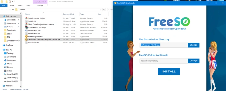 После того, как вы распаковали скачанный .zip архив, откройте файл Official FSO Installer Utility.exe. В появившемся окне вы можете указать путь для установки The Sims Online и файлов FreeSO, но убедитесь, что они размещаются на одном локальном диске. Если у вас нет необходимости менять путь установки, то не делайте ничего и просто нажмите INSTALL.