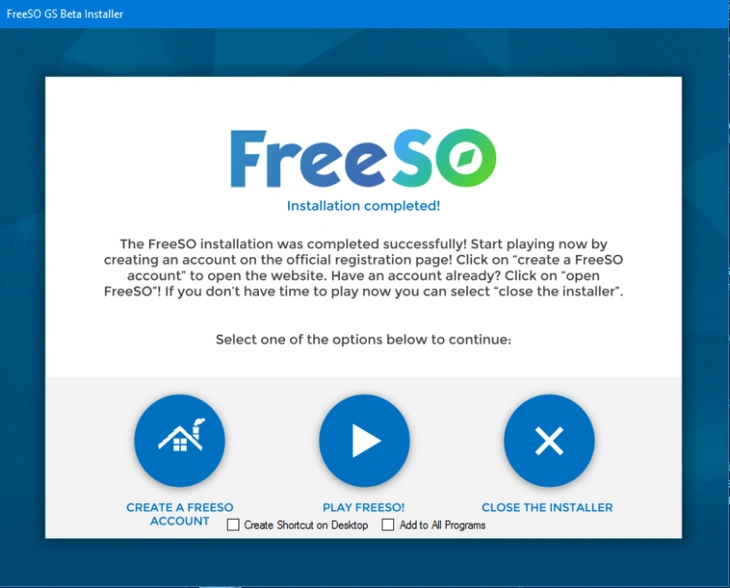 После завершения установки вы можете сразу запустить игру, закрыть установщик или перейти к созданию аккаунта FreeSO - этим мы и займёмся в первую очередь. Кроме того, вы можете создать ярлык игры на рабочем столе, для этого поставьте галочку перед «Create Shortcut on Desktop».