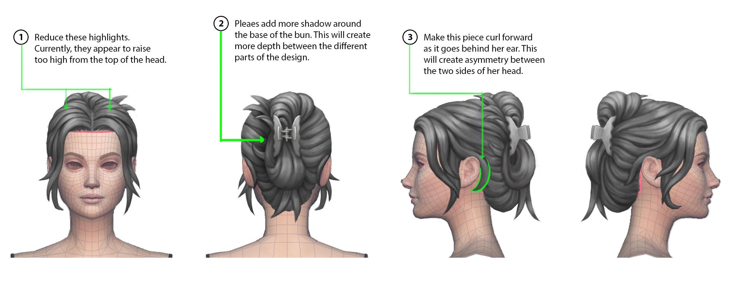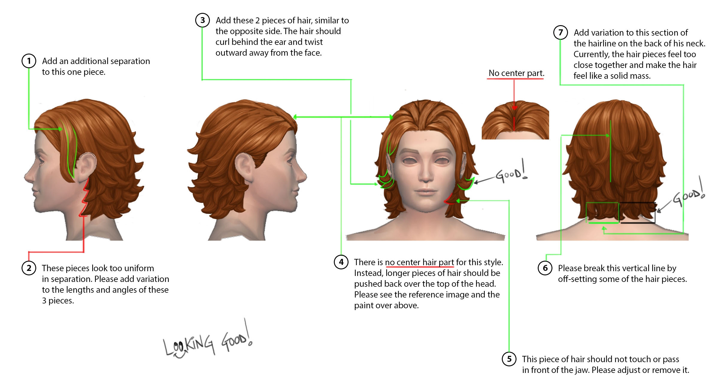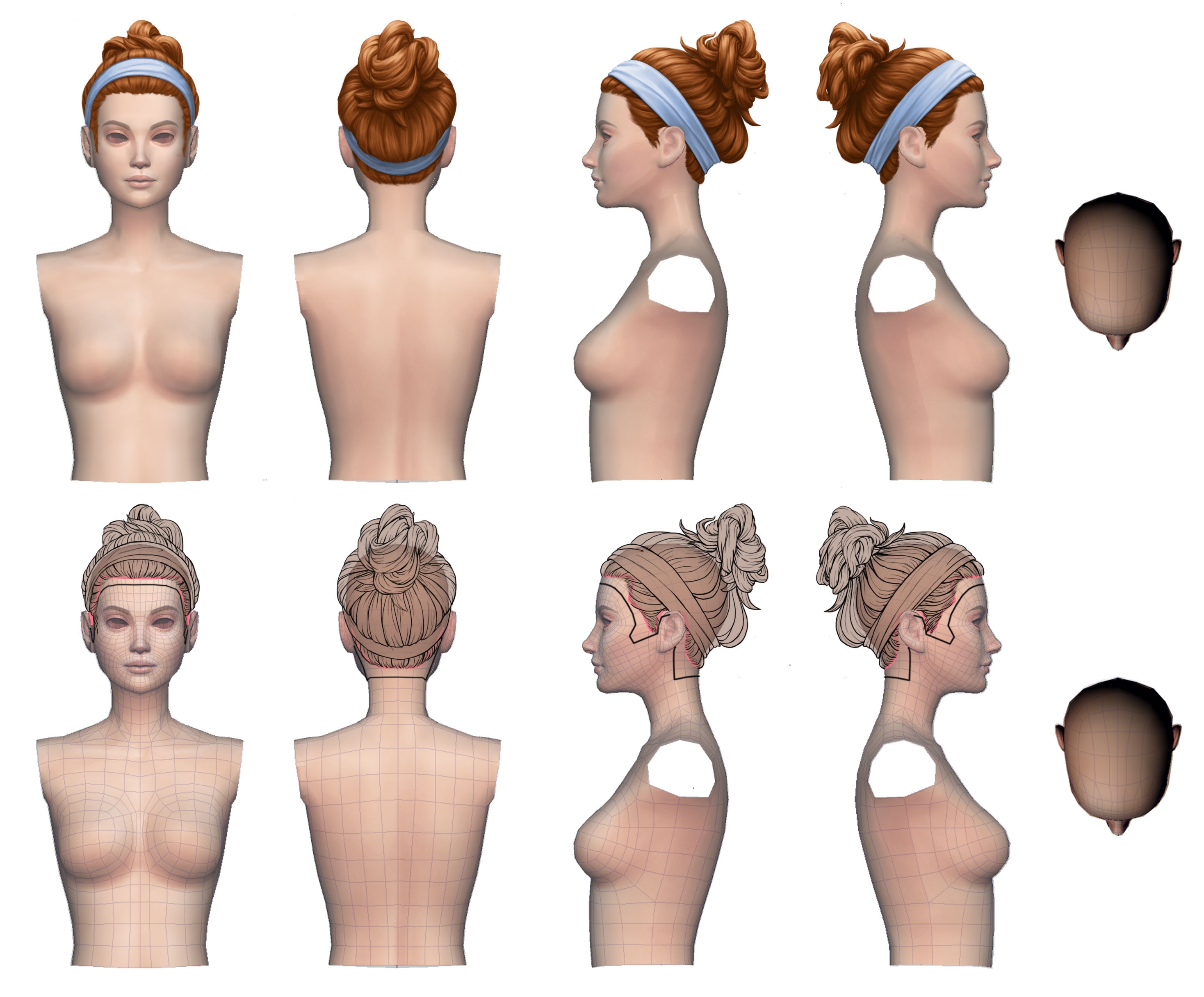 Во-первых, важно заметить, что обычно на создание причёсок уходит больше всего времени среди того, что мы создаём с внешними партнёрами. Процесс начинается со сбора справочных фотографий людей с причёской, которую мы создаём, чтобы у нас было несколько примеров того, как эта причёска может выглядеть. После этого наши художники рисуют их интерпретацию этой причёски, наложенную на лысого сима. Они создают две версии таких зарисовок: одна — непрозрачная, она демонстрирует, как должен выглядеть финальная поверхность, а другая — прозрачная, чтобы у модельщика был ясный пример формы и объёма причёски в сравнении с расположением головы сима. В течение этого времени происходят изменения, основанные на отзыве нашего арт-директора. Хоть этот процесс не сильно отличается от других вещей, количество деталей в каждой причёске подразумевает, что такие вещи попросту дольше создавать, чем предметы и одежду. В итоге, это влияет на наш график разработки; как правило, мы ставим выбор причёсок перед предметами и одеждой, чтобы у наших художников и внешних партнёров было больше времени на работу с ними. Принимая в учёт голосования в рамках этого проекта, это означало не только то, что мы не могли ждать, пока включим [причёски] в голосования за предметы/одежду, но и то, что у нас даже не будет времени на проведение отдельного голосования за причёски. В общем, как только у нас на руках были результаты голосования за стиль [каталога], мы немедленно должны были начать работу над причёсками. Это было таким препятствием для этого проекта, когда мы не могли понять, как нам включить голосование за причёски без откладывания сроков нашего графика разработки.