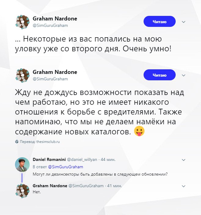 Любопытные фанаты обнаружили, что изображения, которые продюсер устанавливал в качестве аватарок, были взяты с сайта по истреблению вредителей. Вместе с этим фан-сайт SimsCommunity напомнил, что совсем скоро 18-летие франшизы The Sims и поскольку команда игры постоянно радует нас новыми обновлениями в честь этой даты, можно предположить, что с ближайшим обновлением в игру будут добавлены вредители.