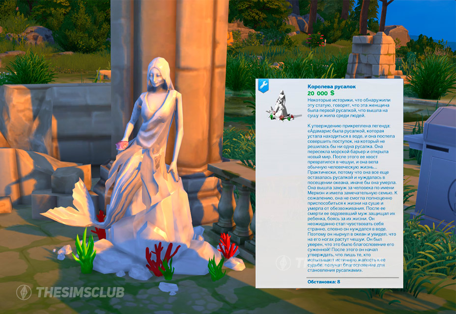В первую очередь, вам необходимо приобрести статую «Королева русалок», которая стоит §20.000. Она находится в категории «Скульптуры», но рекомендуется найти её через поиск по слову «Королева». После покупки вам станут доступны два взаимодействия: