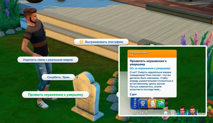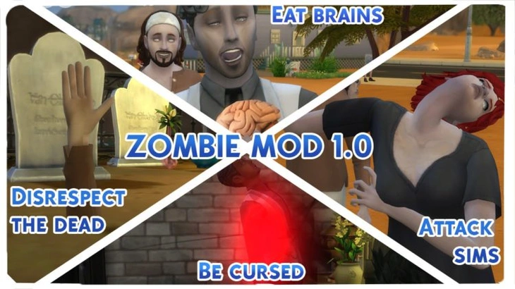 Чтобы стать зомби нажмите на любое надгробие в игре и выберите взаимодействие «Проявить неуважение к умершему». Смерть будет очень недовольна таким поведением, поэтому наложит на вас проклятие, о чем будет сообщено в мудлете. После завершения действия мудлета (2 дня) ваш сим будет превращен в зомби.
