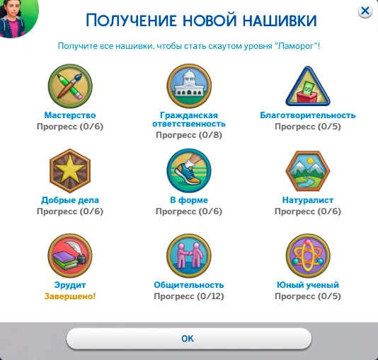 | "Ламорог" | 9 нашивок | Золотой кубок скаута, форма опытного скаута, черта характера “Талантливый скаут” |
