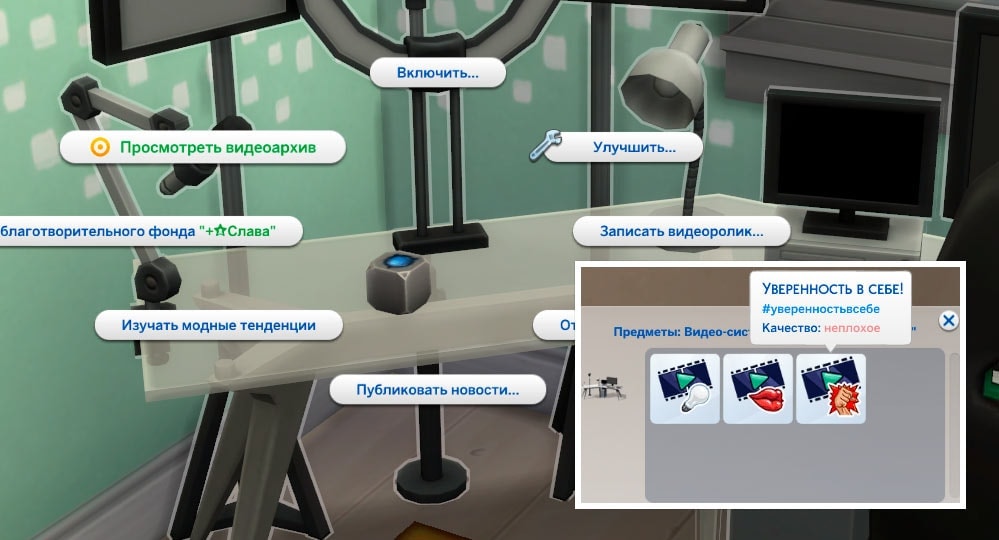 Чтобы создать видео нажмите на видео-систему и выберите тему с помощью взаимодействия «Записать видеоролик». Основные темы всего три: отзыв о продукте (гаджеты, косметические товары, игрушки), советы по уходу за собой и модные советы, но также у вас появится дополнительная тема, если ваш персонаж в определённом настроении. Например, если он в уверенном настроении, то сможет записать видеоблог "Уверенность".