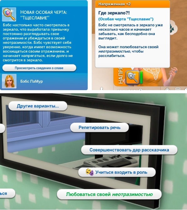 Также есть система особых черт: если ваш персонаж часто ведет себя определенным образом, то скорее всего получит одну из них. Например, частое использование телефона гарантирует получение черты «Общедоступный номер» из-за которой вам будут писать поклонники и ненавистники, или если вы будете часто смотреться в зеркало, то можете получить черту «Тщеславие». Хотя нам показалось странным получение этой черты из-за того, что персонаж несколько раз подряд пытался успокоить себя с помощью зеркала. В любом случае, такие черты вовсе не показались нам лишними, а даже напротив. Тем более, что их всегда можно удалить с помощью зелья «К чёрту черту!», купленного за баллы счастья.