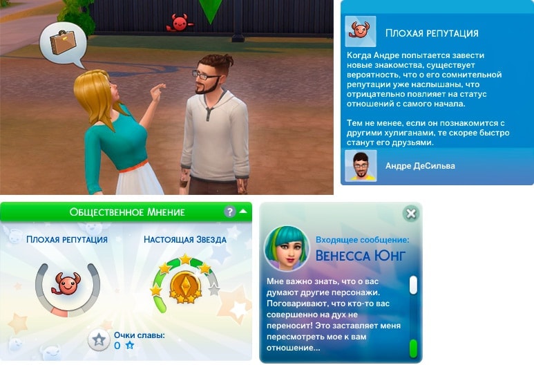 Тесно связана со славой репутация, которая зависит от вашего отношения к другим персонажам и может быть отрицательной, положительной или нейтральной. Важно отметить, что решающим фактором в репутации является отношение симов к вашим действиям. То есть если вы ввяжетесь в драку на глазах у злого персонажа, то он воспримет это как положительный поступок.
