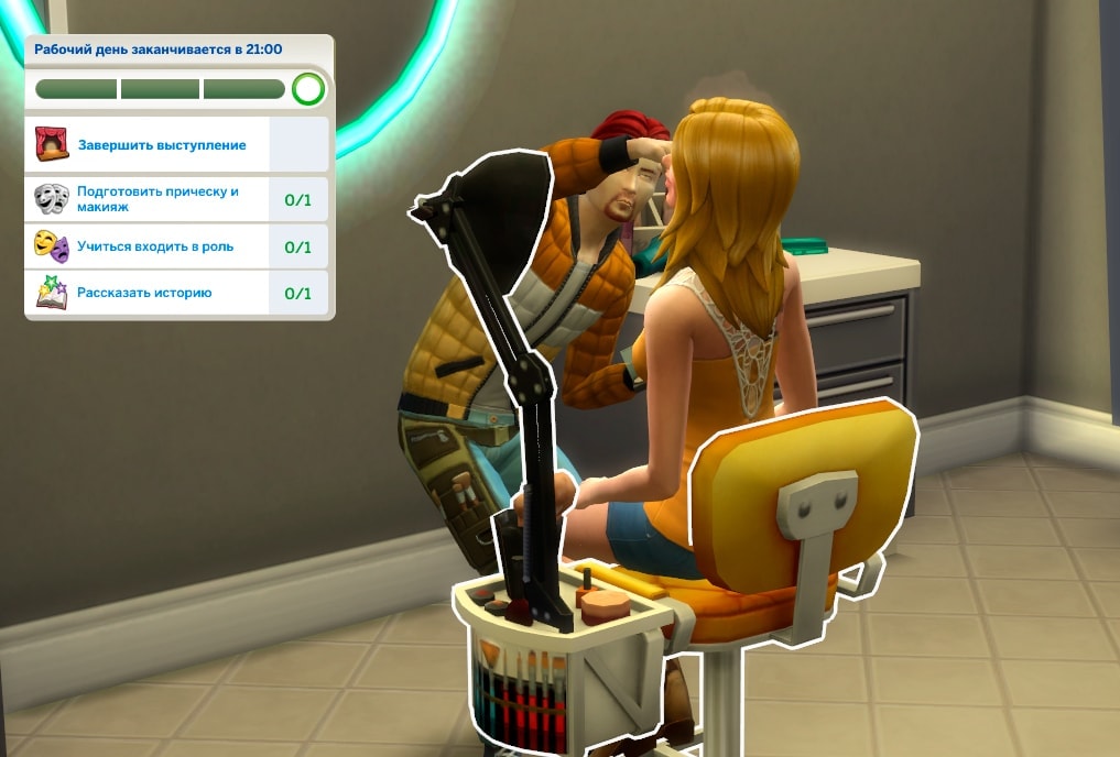 Прибыв в студию, персонаж получит определенный список задач для подготовки к съемкам. Как только вам сделают прическу и макияж, а также переоденут в костюм, вы сможете сообщить режиссеру о готовности приступить к съемкам. Но вы также можете выполнить другие задачи, которые сделают текущую смену ещё успешнее. Однако имейте в виду, что вы не сможете вернуться к невыполненным задачам после съемок. Актёры высокого уровня могут вовсе пропускать эти задачи, а также самостоятельно выбирать себе наряд и прическу.