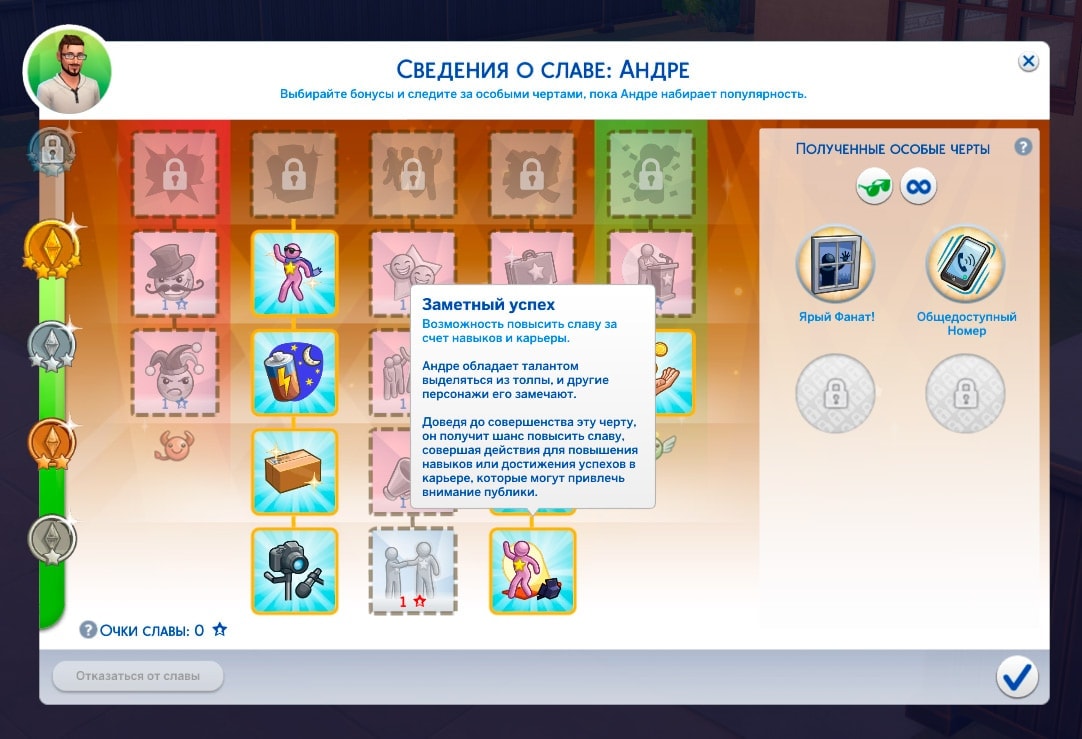 Слава состоит из 5 уровней, каждый из которых открывает новые возможности для вашего персонажа и привлекает всё больше внимания общественности к нему. Например, возможность прославиться с помощью благотворительной деятельности. Имейте в виду, что изначально вы не будете получать славу, повышая навыки и продвигаясь по карьерной лестнице — вам нужно приобрести специальный бонус для этого. Более знаменитые персонажи также могут получить доступ к закрытым местам в городке, которые даже можно строить самостоятельно. Самые знаменитые персонажи всегда выделяются: у них есть специальное свечение и уникальная походка, которые, впрочем, можно отключать!