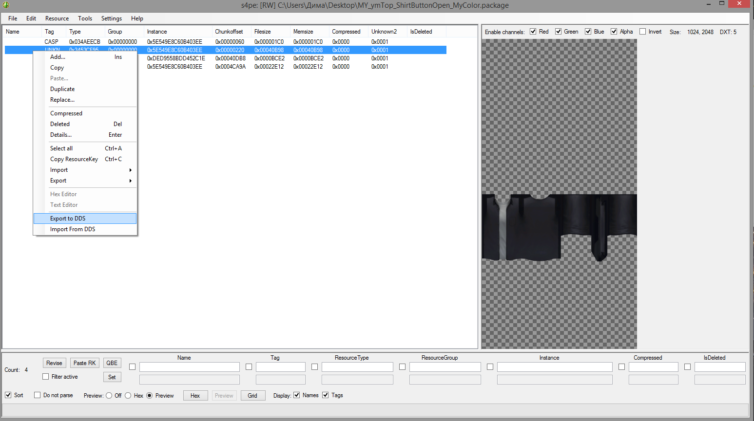 Теперь возвращаемся к программе S4PE, нажимаем правой кнопкой на файл текстуры и выбираем «Import From DDS» и теперь выбираем файл, который мы экспортировали из фотошопа или другого графического редактора. Теперь мы увидим следующее: