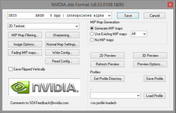 Выставите настройки такие же как на скриншоте выше и нажмите «Save». Если вы используете другой графический редактор, то при экспорте должно использоваться сжатие BC3/DXT5 и установлено создание множественных отображений.
