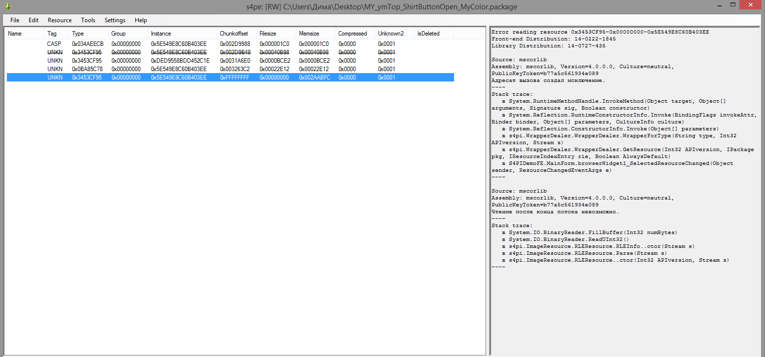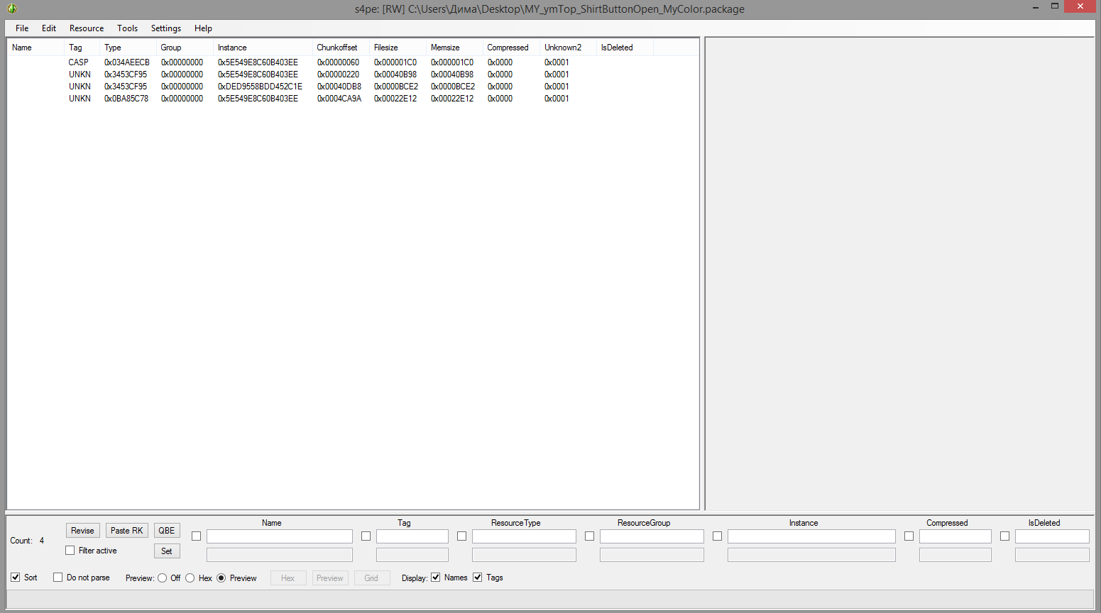 Теперь переходим к программе S4PE. Открыв её, нажмите в верхнем меню «File > Open...», и выберите файл, который мы экспортировали из CASRecolorTool. После открытия вы увидите нечто похожее на это: