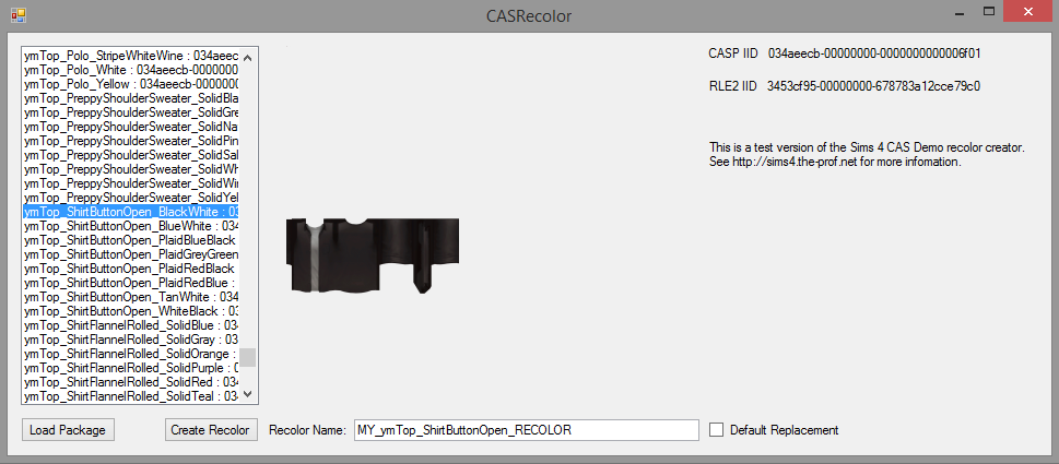 Теперь откройте программу CASRecolorTool, нажмите «Load Package» и откройте файл «CASDemoFullBuild.package», который вероятнее всего находится в С:\Program Files (x86)\Origin Games\The Sims 4 Create A Sim Demo\Data\Client.
