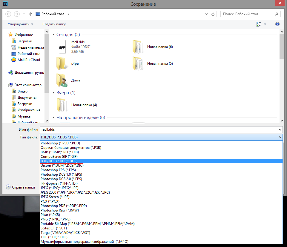 После того, как вы завершили изменять текстуру, нажмите в верхнем меню «Файл > Сохранить как...» и в выпадающем списке выберите формат DDS и нажмите «Сохранить»: