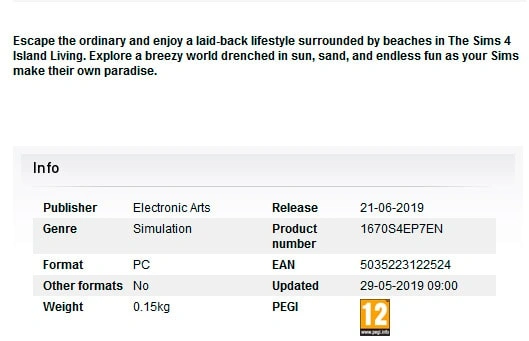 На сайте скандинавского ритейлера Pan Vision было обнаружено дополнение «Жизнь на острове» для The Sims 4, которое, по информации с сайта, выйдет уже 21 июня! В данный момент страница уже недоступна, но игроки успели сделать скриншот.