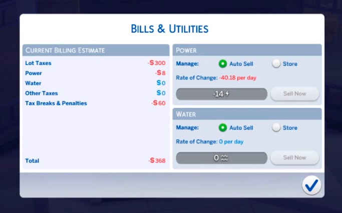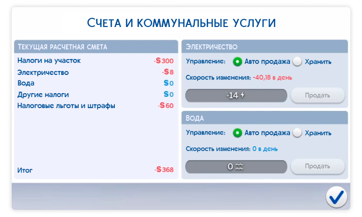 Новое окно коммунальных счетов, в котором детально расписаны расходы на налоги, воду и электроэнергию. Владельцы дополнения «Экологичная жизнь» смогут вырабатывать энергию и воду. К тому же, если вы будете потреблять меньше, чем производить, то остатки сможете продать.