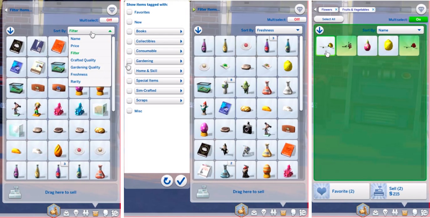 Теперь вы можете сортировать предметы в нём по названию, цене, качеству, редкости, а также отобразить предметы только из определенной категории: книги, растения, коллекционные предметы, предметы для сада, предметы для навыков, созданные симом предметы и т.д.