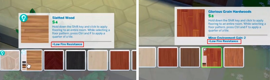- Некоторые объекты Режима строительства (например, напольные покрытие) теперь будут иметь примечание о низком показателе огнеупорности, которое влияет на вероятность возникновения пожара. Влияние этого свойства на игру можно отключать в настройках;