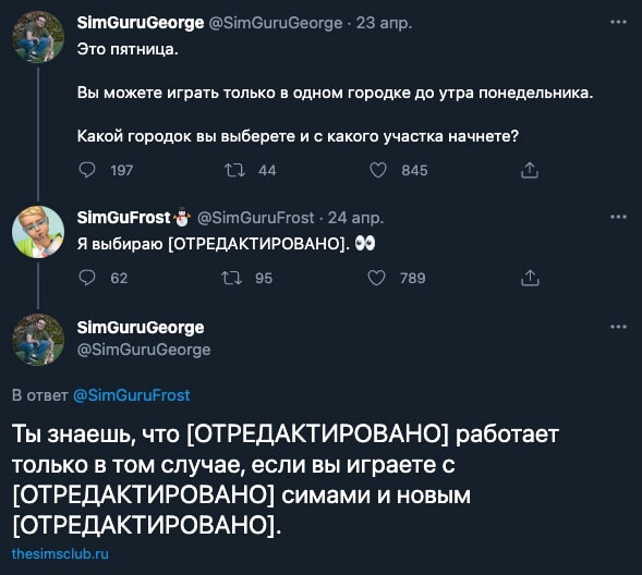 В данном случае, вероятно, речь про новый городок. Однако это не всё: ответ SimGuruGeorge на твит Frost содержит упоминание "[ОТРЕДАКТИРОВАНО] симов" — возможно, нас ждет новая форма жизни. Так или иначе, точно можно сказать, что совсем скоро нас ждет анонс нового контента для игры!