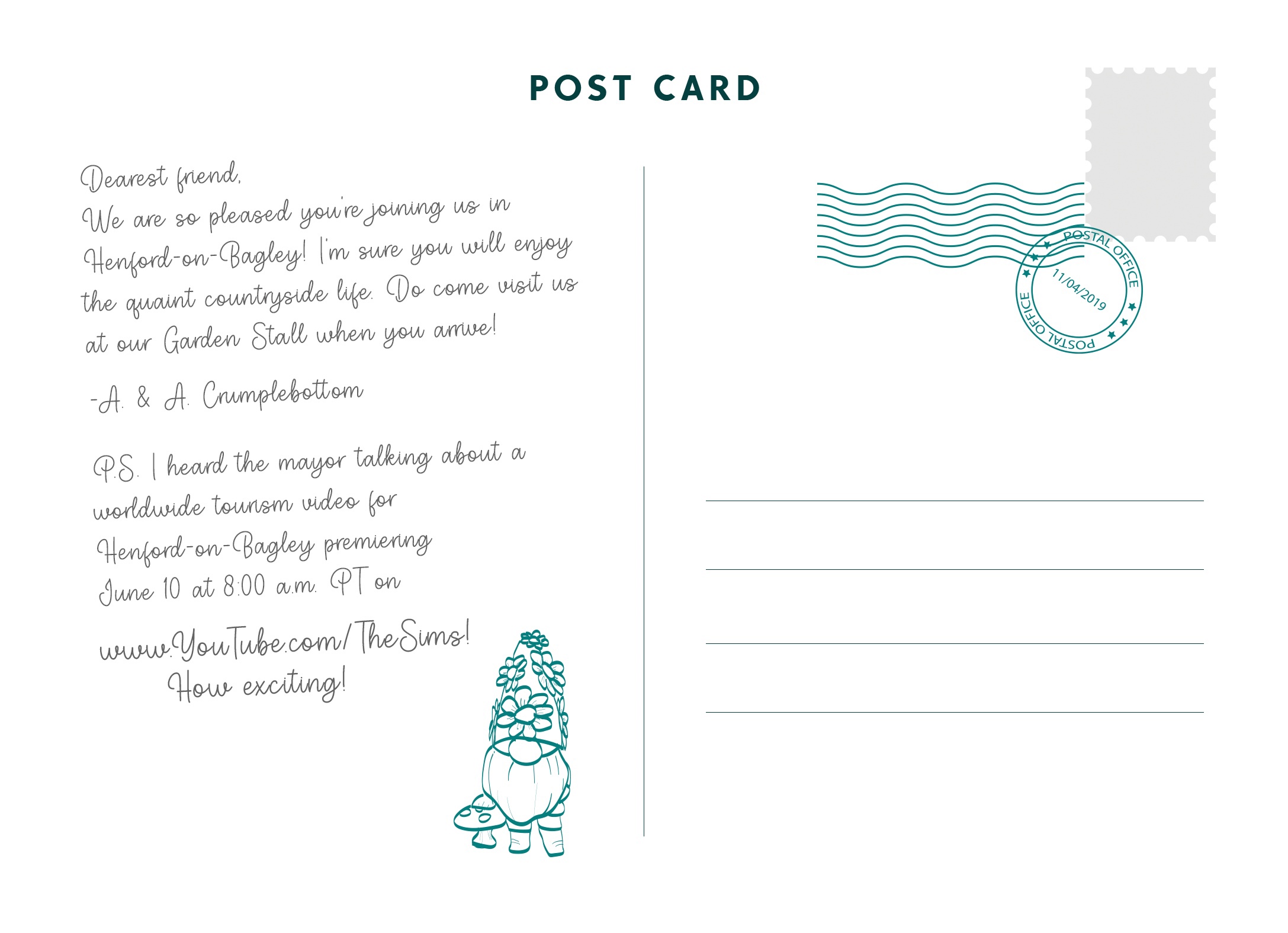На открытке можно увидеть новый деревенский городок, а сама она написана от лица семейства Крамплботтом (известное также как Толстопятко в русской версии игры)! От их лица нас приглашают окунуться в мир загородной жизни с садовыми прилавками. Ниже приводим вам перевод данного письма на русский язык.