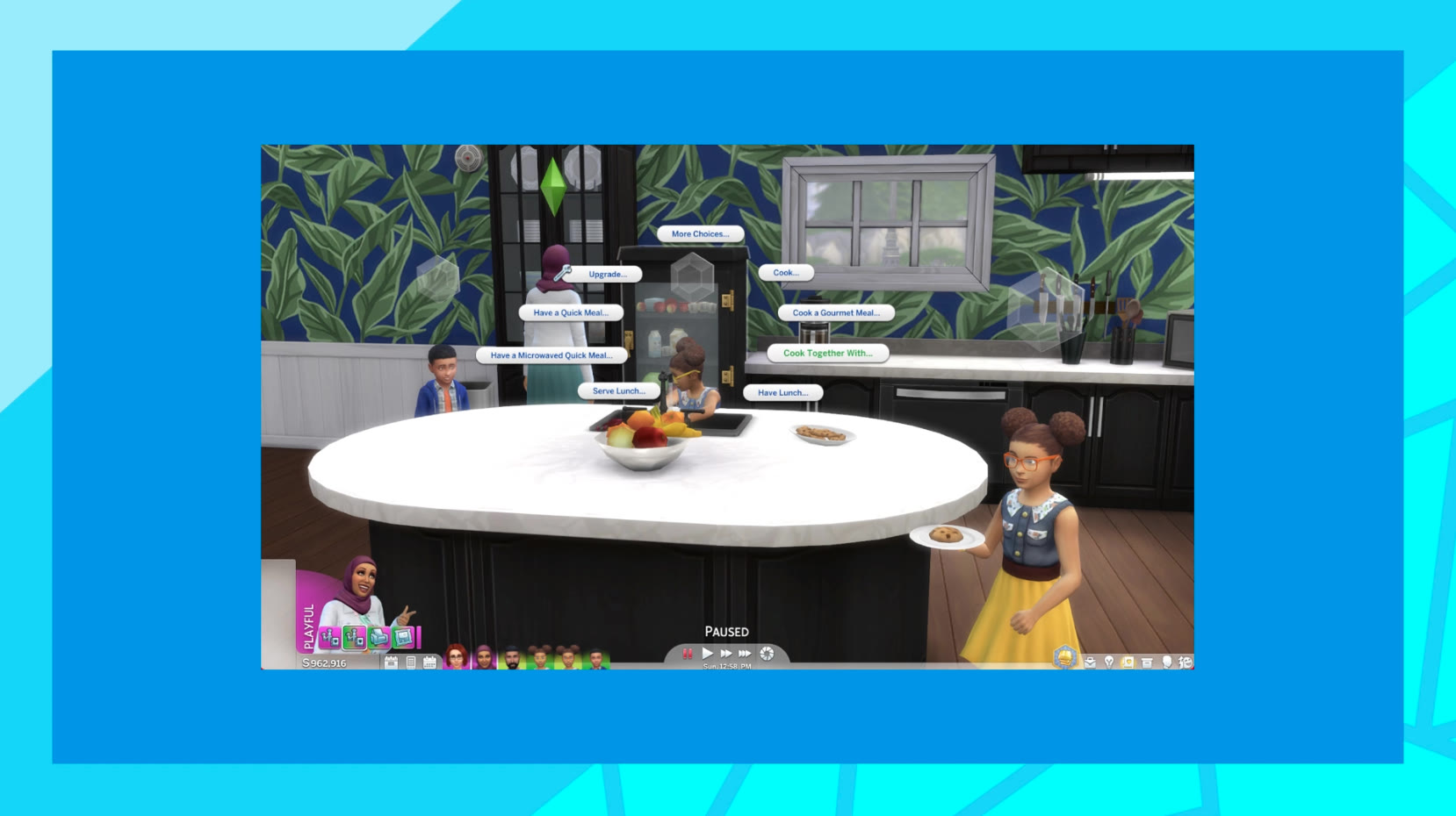 - Совместная готовка: до 5 симов, приводит к улучшению отношений между симами, повышенному качеству еды, увеличенному размеру порций, а также возможному появлению чувств между симами;