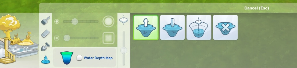 Инструмент создания водоёмов работает вместе с инструментом изменения ландшафта. Вам необходимо сначала углубить ландшафт, а затем заполнить его водой.