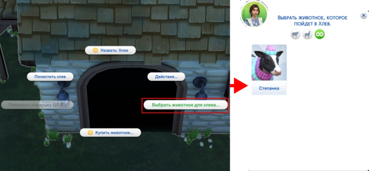 По возвращении домой не забудьте вернуть свою любимицу назад! Для этого нажмите на хлев и нажмите на действие "Выбрать животное для хлева...".