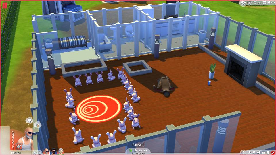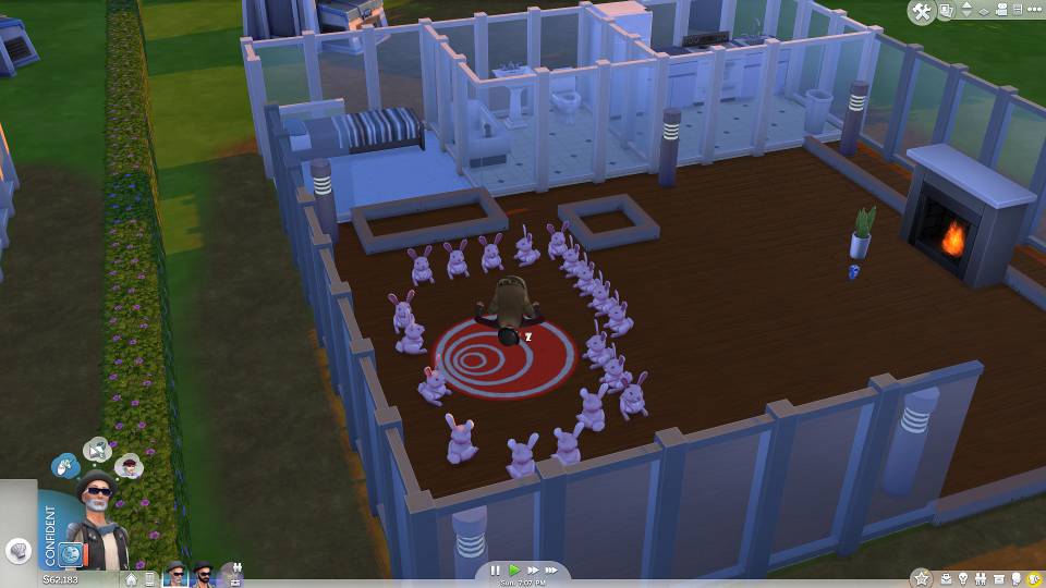 А могут ли мне в этом помочь... кролики? К слову говоря, Злой не был в доме совсем-совсем один. Я окружил его отрядом маленьких розовых игрушечных кроликов. Первое время ему это совсем не нравилось: во-первых, он проголодался, во-вторых, хотел спать, а повсюду были только эти чертовы кролики. Он постоянно злился на меня, своего нового Бога, ругался и размахивал руками. Но прошла уже игровая неделя, а Злой все никак не хотел умирать без еды, воды и нормального сна. До меня в конце концов дошло – все это время его спасали кролики, потому как они были единственными предметами, с которыми он мог взаимодействовать. Поэтому навык досуга у Злого всегда был на высочайшем уровне. В итоге сим просто сошел с ума. Ему уже вообще ничего не нужно было, кроме этих кроликов. Он даже не жаловался ни на что, ему и с кроликами было классно.