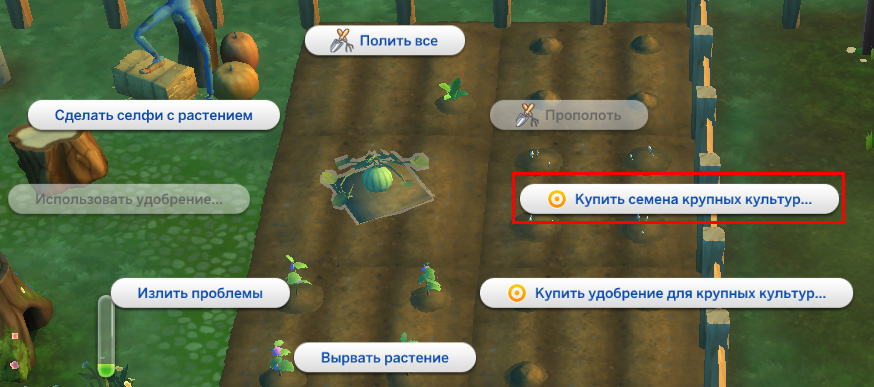 - нажать на грядку и выбрать действие "Купить семена крупных культур...";