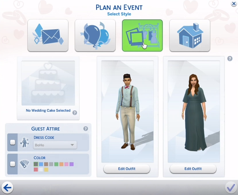 • Вы можете выбрать ожидаемый от гостей дресс-код. Например, чтобы все пришли в одежде определённого цвета и определённого стиля. Также на этой же панели выбирается свадебный торт (который вы сможете добавить позже, если, например, готовите его сами), а также настроить одежду для брачующихся.
