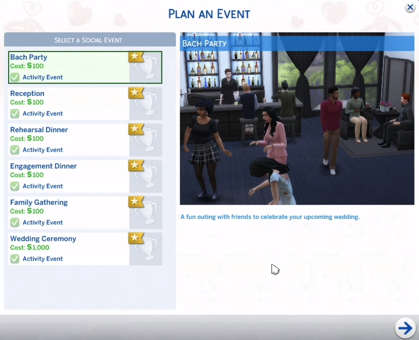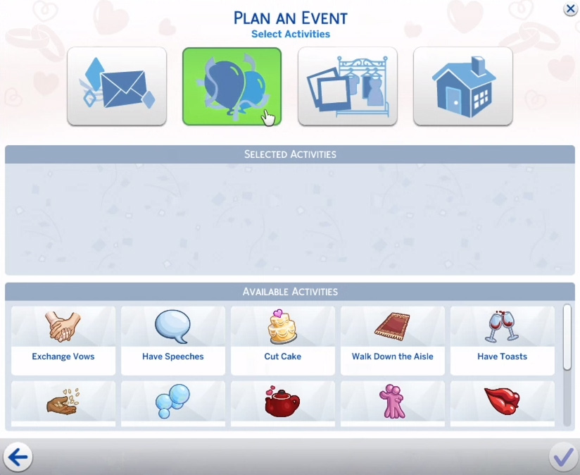 • Вы сможете настроить свадьбу так, как вы захотите, выбрав желаемые активности. Среди них: обменяться клятвами, произносить речи, разрезать торт, пройти по ковру, поднять тост, бросать рис, надувать мыльные пузыри, распивать чай, разделить первый танец, поцелуй новобрачных, пить, танцевать и разделить церемониальную трапезу.