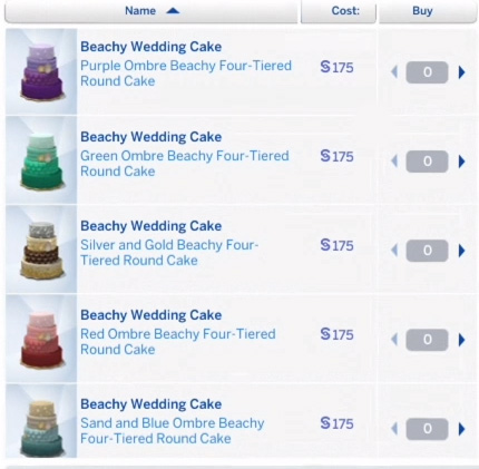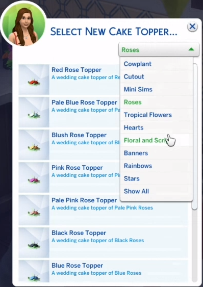• Выбор торта завершается выбором верхушки, для которых существует большой выбор. Вы можете украсить торт жвачным растением, вырезом, мини-фигурками симов, розами, тропическими растениями, сердцами, цветочными элементами с лентами, баннерами, радугой и звёздами.