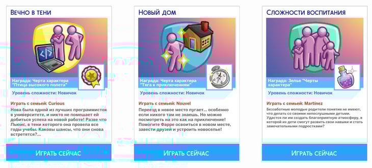 Новые стартовые сценарии — это отличный способ научиться дружить, строить карьеру и справляться с семейными обязанностями! Вас ждет три новых сценария с глубоким игровым процессом, готовыми семьями и наградами, которые зависят от ваших результатов!