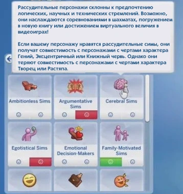 Новые категории носят названия «Характеристики симов» и «Темы для разговоров». Совместимость по этим показателям будет высчитываться на платоническом уровне, а у персонажей-подростков и старше также влиять на успех установления романтических отношений. Очевидно, что некоторые темы и характеристики, например, связанные с романтикой, будут заблокированы для детей.