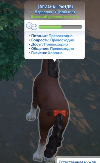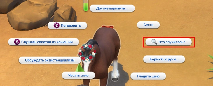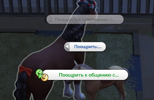 | 3 | Доступно действие "Обсуждать тайную жизнь животных", действие "Обнять" (для жеребят) |