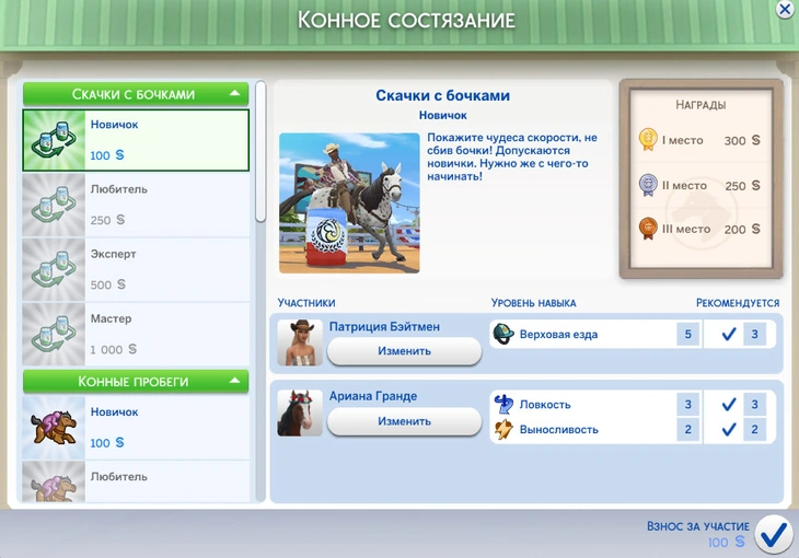Конных состязаний всего 5: скачки с бочками, конные пробеги, конкур, вестерн-плежер и Главный чемпионат. У каждого состязания, кроме последнего, четыре уровня сложности: с новичка до мастера. Изначально вы можете принять участие только в состязаниях для новичков, и после завоевания одного из первых трёх мест вы сможете подняться на сложность выше. Обратите внимание: жеребята и беременные лошади не могут участвовать в состязаниях.