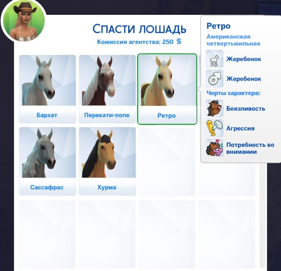 Вы можете завести лошадь несколькими способами: создать в CAS при создании семьи, купить её за 1000 симолеонов или спасти за 250.