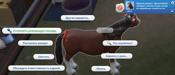 Когда лошадь начнёт рожать, она начнёт испытывать дискомфорт. Персонаж может помочь своей любимице в ответственный момент, выбрав действие "Успокоить рожающую лошадь".