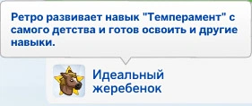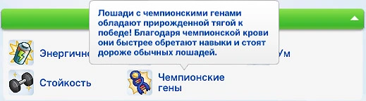 | Чемпионские гены | Лошадь быстрее обретает навыки, стоит дороже | Черта характера "Лошадь-чемпион" у одного из родителей |
