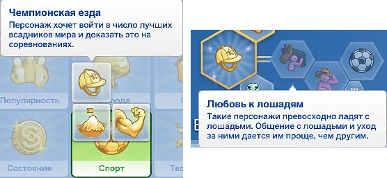 Любителям лошадей будет полезно приобрести черту характера "Любовь к лошадям", а желающим покорить Олимп в плане верховой езды — цель всей жизни "Чемпионская езда" в категории "Спорт"!