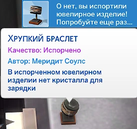 При низком уровне навыка и плохом самочувствии персонажа вы рискуете испортить украшение! В таком случае в нём будет отсутствовать инкрустация, а кристалл будет утрачен навсегда!