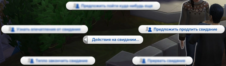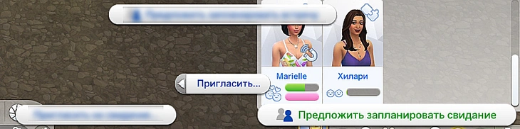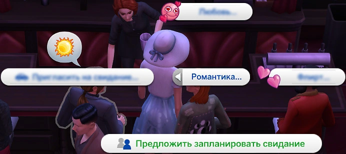 Если вы общаетесь с каким-то персонажем и вы понимаете, что хотели бы пригласить его на свидание, то смело кликайте по этому персонажу, переходите в категорию романтических взаимодействий и нажимайте на действие "Предложить запланировать свидание"!