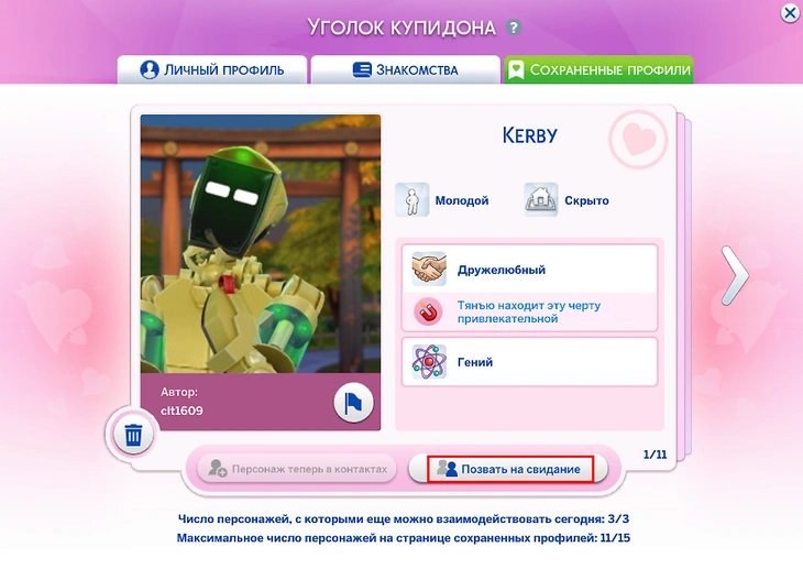 Приложение для знакомств "Уголок купидона" позволяет вам завести приятные знакомства! Если вы нашли персонажей по душе и поставили им лайк, они появятся в разделе "Сохранённые профили". Найдите профиль персонажа и нажмите внизу клавишу "Позвать на свидание".