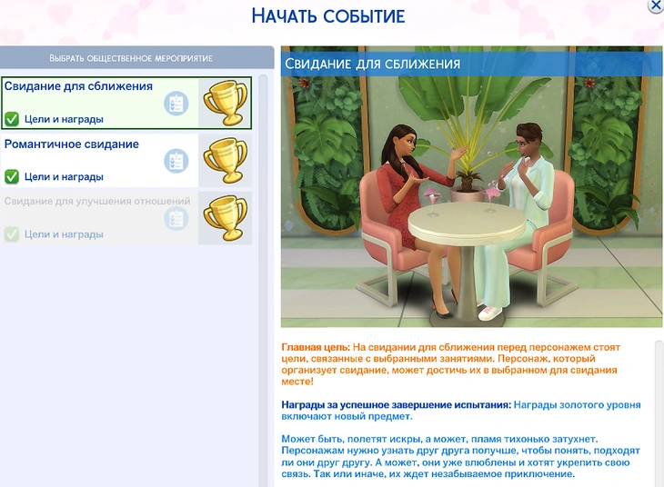 Всего в «The Sims 4: Стрелы купидона» 4 новых типа свиданий. Они устраиваются с разной целью, но по своей сути представляют собой одно и то же — смену обстановки, чтобы сблизиться со своей, возможно, будущей, второй половинкой!