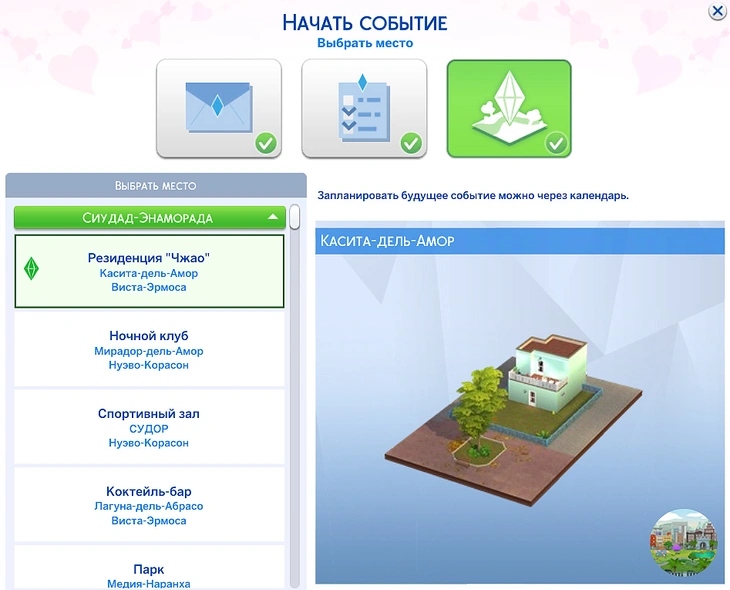 После того, как вы определитесь с гостями и занятиями, вам будет предложен выбор места для проведения свидания. Выбирайте место исходя из тех занятий, что вы выбрали, но помните, что ничто не мешает вам перенести свидание куда-нибудь ещё!