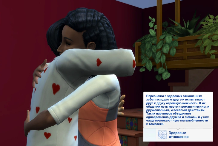 Персонажи в здоровых отношениях не только любовники, но и друзья! Они используют дружелюбные, весёлые и романтические взаимодействия при общении и чаще вызывают друг у друга чувства влюблённости и близости!