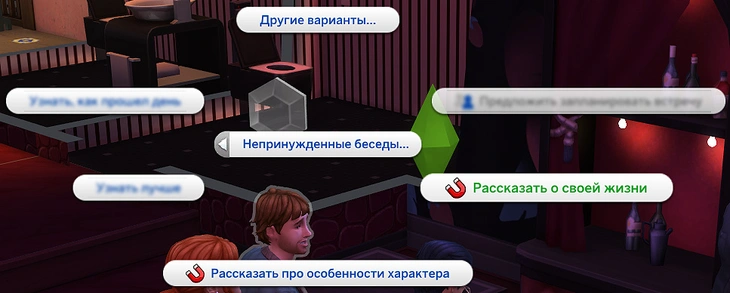Не забудьте рассказать и о себе! Перейдите в категорию дружелюбных действий, раздел "Непринуждённые беседы" и выберите любое из действий "Рассказать о своей жизни" или "Рассказать про особенности характера", обозначенных магнитом!