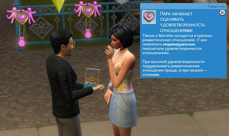 Удовлетворённость отношениями показывает то, насколько довольны друг другом партнёры в отношениях. Она не появляется, когда ваши персонажи несколько раз пофлиртуют друг с другом, а только после перехода романтических отношений на значительную ступень: например, после свидания или вступления в серьёзные отношения.