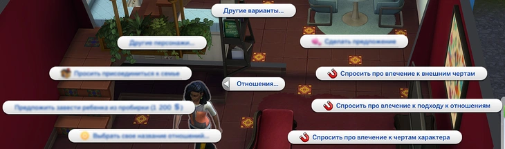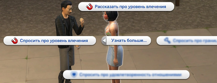 Привлекательные черты есть не только у вашего персонажа, но и у других! Чтобы узнать о них, перейдите в категорию "Отношения" и выберите действия "Спросить про влечение к внешним чертам", "Спросить про влечение к подходу к отношениям" и "Спросить про влечение к чертам характера", обозначенные магнитом.